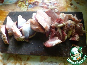- Мясо (любое у меня немного свинины и 2 гусиных пупка) — 200 г