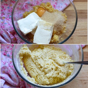 В рисово-тыквенную смесь добавим творожную ванильную массу, сахар, яйцо, и пару ложек муки.