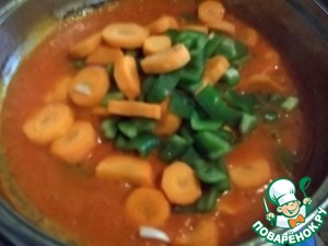 Добавить морковь и болгарский перец и жарить еще минут 5, пока томатное пюре хорошо прожарится.