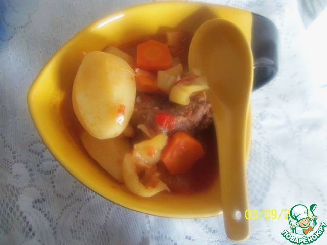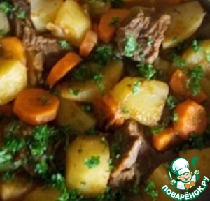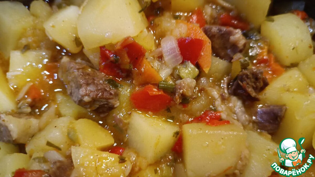 Затем добавить мясо, картофель и влить 1,5 стакана мясного бульона. Тушить под крышкой до готовности картофеля (25-30мин.) Во время тушения посолить, добавить смесь перцев и зелень. Следить за количеством жидкости, по необходимости добавить немного бульона (но соус должен быть достаточно густой)