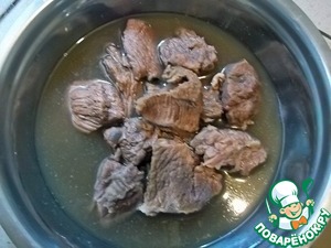 Заранее отварить до готовности мясо, нарезанное кусочками.