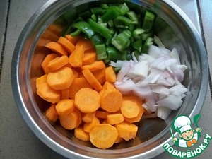 Морковь нарезать кружочками, лук и болгарский перец как вам нравится, но не слишком мелко.