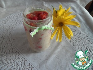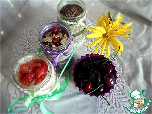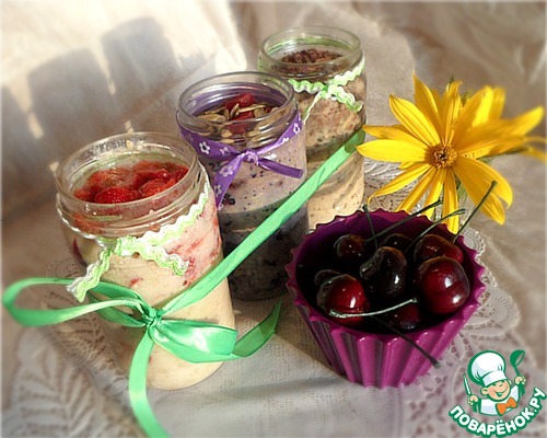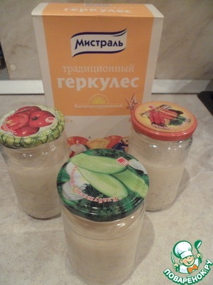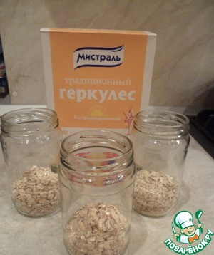 Для приготовления каши понадобятся баночка объемом 0,3-0,5 литра. Все ингредиенты кладем в кашу по вкусу. Насыпаем в каждую баночку на 1/4 часть Гуркулесом ТМ "Мистраль"