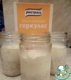 Заливаем кипящим молоком геркулес на 3/4 банки.