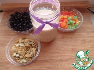 Добавляем вареную сгущенку по вкусу, она придаст каше карамельный привкус, закрываем крышкой и встряхиваем. Оставляем нашу основу каши до утра разбухать или сразу добавляем наши наполнители и с удовольствием угощаемся.