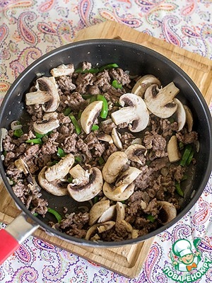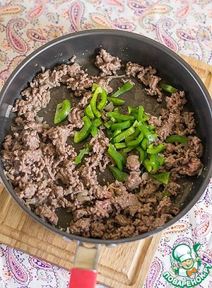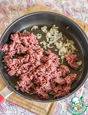 Добавить фарш, перемешать. Продолжать обжаривание около минуты. -