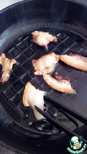 Обжаренный бекон вынимаем из сковороды и выкладываем на бумаждное полотенце. -