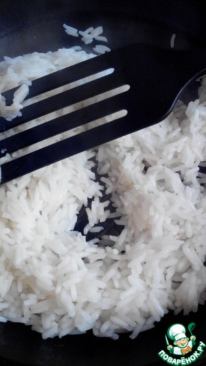 В сковороду с вытопившимся жиром (я большую часть слила, оставила совсем немного) выкладываем готовый рис. Обжариваем на сильном огне минуты 2, периодически помешивая.