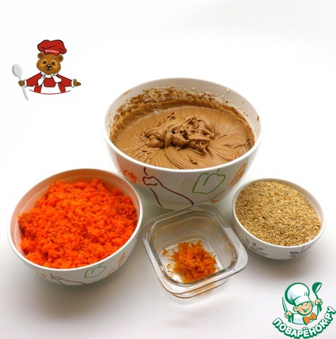 3. Смешайте пшеничную муку с молотой корицей и разрыхлителем и соедините со взбитой массой и замесите тесто. Добавьте дроблёный миндаль, жмых от морковного сока, цедру и перемешайте тесто лопаткой.