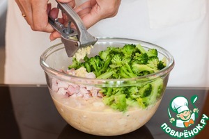 Перемешиваем, не взбивая и добавляем сыр, ветчину, лук, чеснок через пресс и брокколи