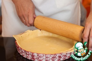 Форму (20 см) смазать сливочным маслом, раскатать тесто в пласт между двумя листами пекарской бумаги, перенести в форму и убрать лишнее при помощи скалки