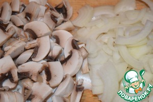 Сначала готовим начинку, для этого режем лук и грибы и обжариваем на режиме ЖАРКА пока грибы не уменьшаться в объеме.