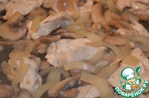 Куриное филе режем на кусочки и добавляем к луку и грибам. Солим и перчим по вкусу, обжариваем до готовности.