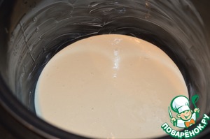 Чашу мультиварки смазываем маслом и выливаем половину теста.