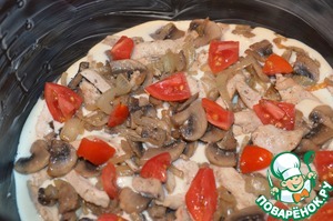 На нее выкладываем начинку из грибов и куриного филе, сверху кладем мелко нарезанный помидор.