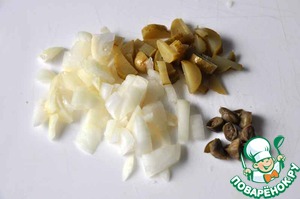 Лук, каперсы и солёный огурец мелко нарезаем.
