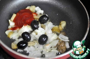 В сковороду наливаем оливковое масло, кладём лук, томатную пасту, каперсы, огурец, оливки и сахар. Всё прогреваем пару минут.