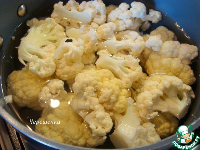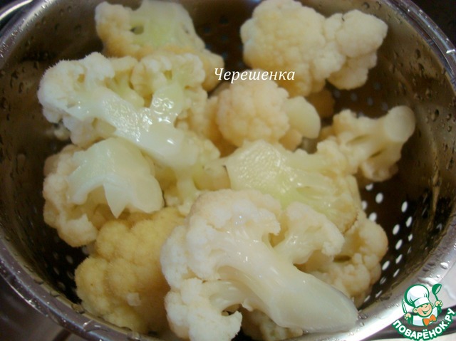 • Цветную капусту разобрать на соцветия и отварить в течение 5 минут.