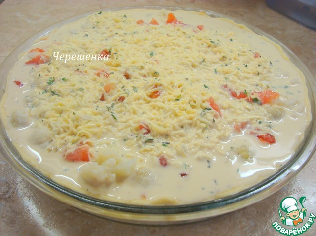 • Сверху на тесто выложить цветную капусту и помидоры, предварительно очищенные от кожуры и порезанные на кусочки.