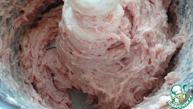 Мясо пропустить через мясорубку с решеткой 2мм — 2-3 раза; Мешать до поглощения свободной влаги, добавляя понемногу ледяное молоко; Оболочку ополоснуть под краном для придания эластичности; |