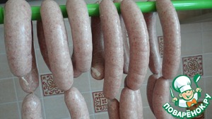Подвесить набитые сардельки при комнатной температуре - на 2-3 часа;