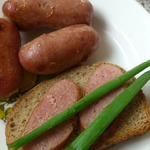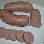 Набивать череву плотно, не допуская попадания воздуха и перекручивая (в разные стороны поочередно) каждые 10-11 см, формируя сардельки;