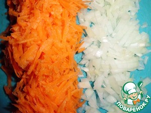 Морковь трем на мелкой терке, режем лук и отправляем на сковороду. Готовим до готовности...