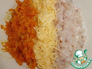 Натираем на мелкой терке сыр, добавляем к кальмарам. Туда же отправляем и нашу морковь... Перемешиваем, при необходимости солим (я солила при жарке)