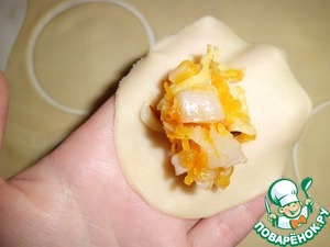 "Отдохнувшее" тесто раскатываем тонко, вырезаем кружочки. Кладем в центр начинку и формируем манты...