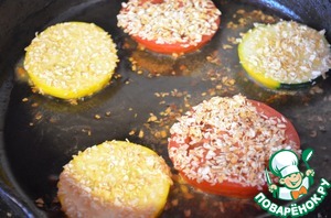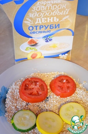 Кабачок и помидор порезать кружочками, обвалять в отрубях.
