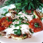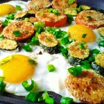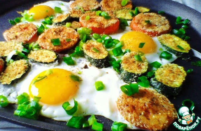 Нагреть сковородку с растительным маслом, обжарить с одной стороны кабачок и помидор. Как только перевернули их на другую сторону, сразу же вбиваем яйца. Солим по вкусу. Посыпаем зеленью. Подаем в горячем виде.