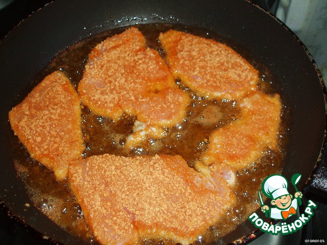 Запанировать кусочки филе, сильно прижимая мясо к панировке.