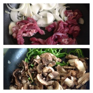 Мясо нарезать тонкой соломкой, лук полукольцами и отправить жариться в сковороду на оливковом масле. Огонь сильный.