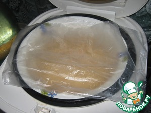 Накрыть тесто плёнкой и поставить подходить в тёплое место примерно на 1 час. Я поставила миску с тестом на чашу мультиварки, включила подогрев на 10 минут, затем выключила.