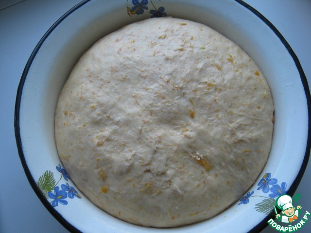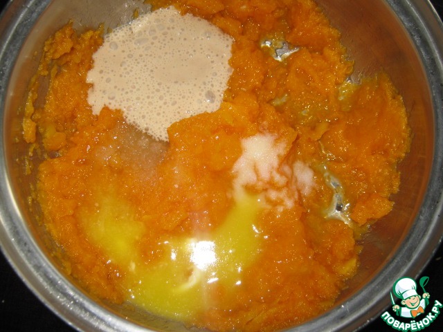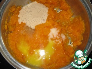Готовую тыкву размять в пюре, добавить соль, сахар, ванилин, растопленное масло и дрожжи. Тыква должна быть тёплая. Дрожжи предварительно смешать с одной столовой ложкой тёплой воды, дать постоять минут 5. Все компоненты перемешать.