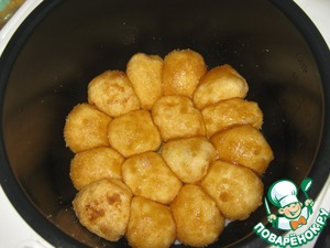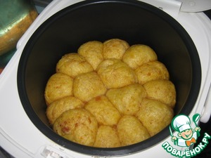 Смазываем чашу мультиварки маслом ( я ещё положила кружок пекарской бумаги) и укладываем шарики теста в один ряд плотно друг к другу. Включаем режим"Подогрев"на 3 минуты, затем отключаем и оставляем тесто подходить в течении 20 минут.