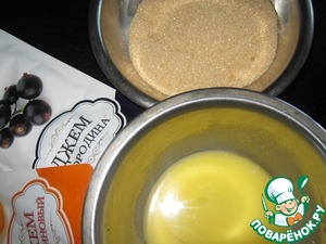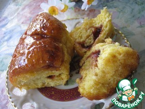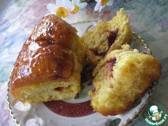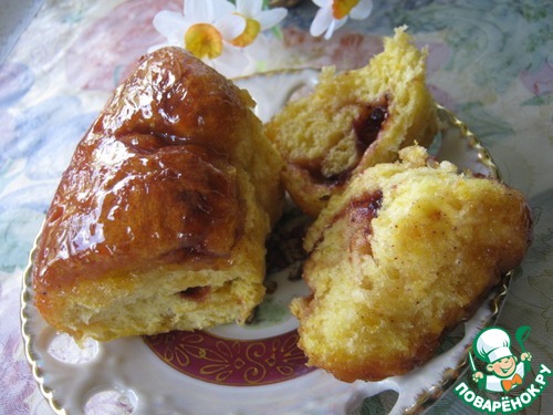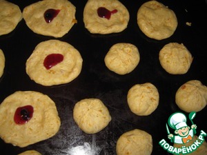 Разделить тесто на 14-16 кусочков. Сделать из них лепёшки, в центр положить немного джема, сформовать шарик.