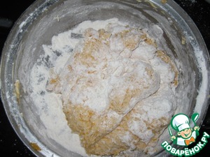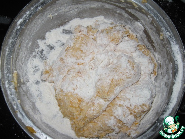 Добавить муку. Муку вводите постепенно в пюре, тыква бывает разной сочности, поэтому муки может потребоваться больше или меньше.