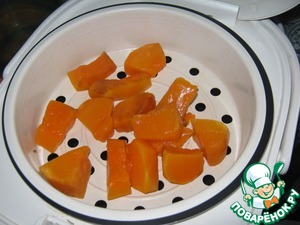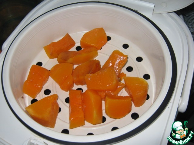 Сначала надо тыкву отварить без воды. Это можно сделать в микроволновке или в мультиварке на пару.