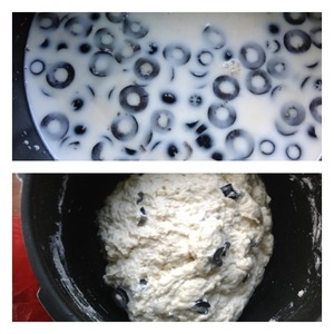 Кружочками нарезать маслины и добавить к молоку, аккуратно перемешать. Добавить сначала рисовую затем пшеничную муку и замесить тесто. Добавить оливковое масло и еще немного вымесить. Тесто слегка липнет к рукам, но муки больше добавлять не надо