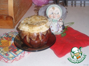 Заливаем супчик в горшочек, закрываем его "шапочкой" из теста. Смазываем ее растительным маслом, обсыпаем зеленью.