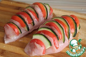 В разрезы укладываю дольку помидора и дольку кабачка.
