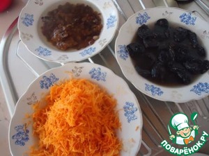 Морковь почистить и натереть на мелкой тёрке. Изюм и чернослив залить кипятком минуты на 3-4.
