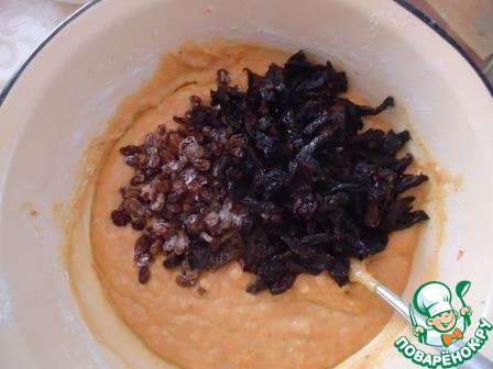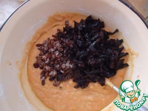 С изюма и чернослива слить воду, подсушить салфеткой. Изюм обвалять в муке, чернослив порезать соломкой, добавить к тесту.