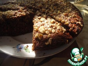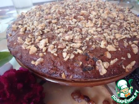 Пирог красивого "шоколадного" цвета, но без какао, с хрустящими орешками и цитрусовой ноткой, с изюмом, мёдом, черносливом и... морковкой. Моя фантазия, превзошедшая все мои ожидания. А самое главное, мужу понравился. Он и название предложил.