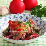 • Помидоры обдать кипятком, опустить в холодную воду и снять кожицу. Нарезать.