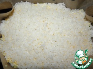 Рыбу нарезать небольшими кусками, посолить, поперчить, и оставить на 15 минут. Рис отварить практически до готовности., немного подсолить. ( чуть не доварить)