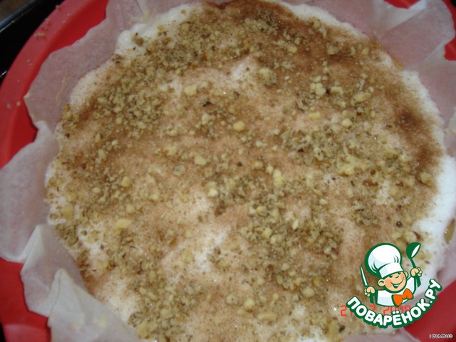 Посыпать корицей с сахаром. Присыпать дроблёным орехом.