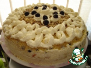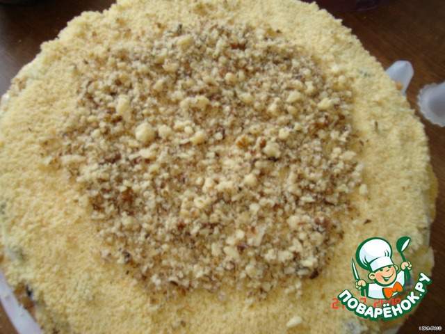 Последний слой из коржа, который выпекался для крошек, + орехи.