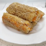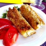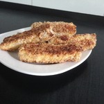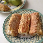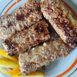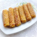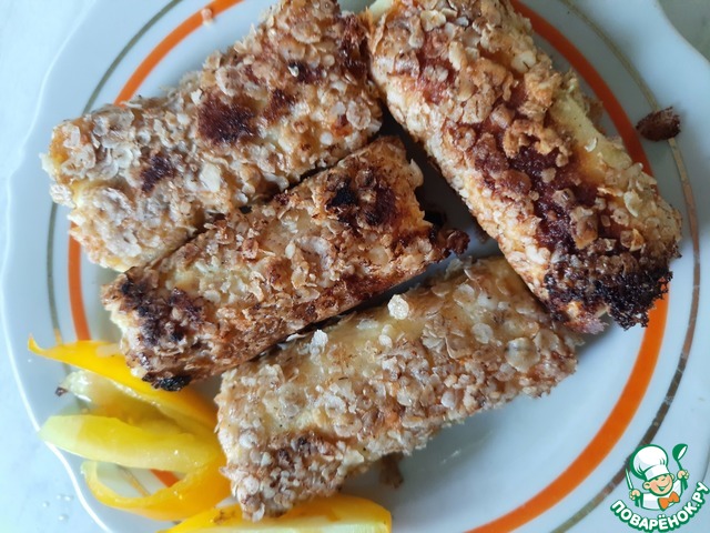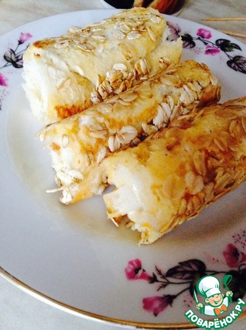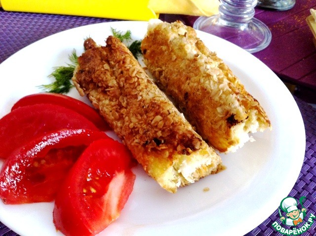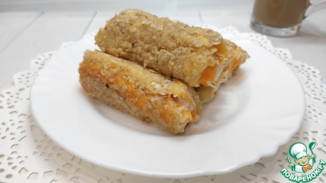 Скручиваем хлеб с сыром в рулет, обмакиваем в яйцо, затем в овсяные хлопья. Затем обжариваем со всех сторон.